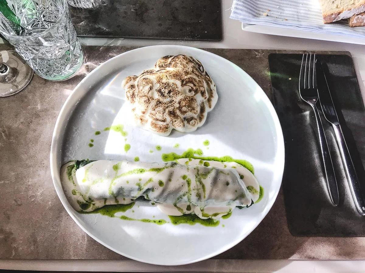 Ultimo piatto di nostra scelta è stato un filetto di ricciola cotto a bassa temperatura, avvolto da bieta, servito con spuma di topinambur, crema di bagna cauda, emulsione di spinacini e riso venere.